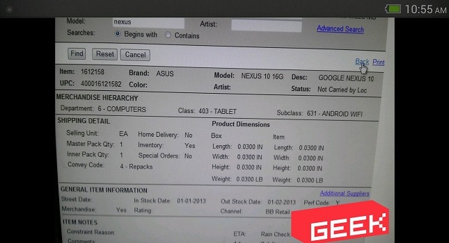 Παράλληλα διέρρευσε και σχετική φωτογραφία στην οποία φαίνεται ξεκάθαρα ότι πρόκειται για το νέο Nexus 10 16G Wi Fi το οποίο μάλιστα κατασκευάζεται από την Asus και όχι από την Samsung, όπως το υφιστάμενο μοντέλο. Επιπλέον αναφέρονται οι διαστάσεις του προϊόντος και οι ημερομηνίες των αποθεμάτων. Να σημειωθεί, ότι πέρσι η Google πρόσθεσε δύο νέους τύπους συσκευών Nexus στο lineup, ένα 7 ιντσών tablet και ένα 10 ιντσών.